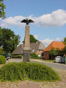 Stele mit Adler im alten Ortskern am Schmiedeberg. Auf einer Bronzetafel stehen die Namen der Gefallenen. Am Sockel eine weitere Tafel in Gedenken an die Opfer des 2. Weltkriegs ohne Namen.