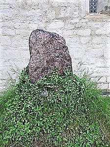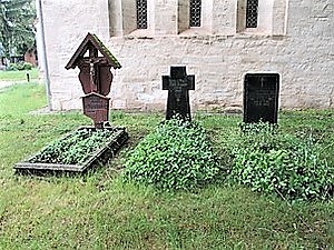 Auf dem Friedhof steht an der Kirchenmauer auf einem kleinen Erdhügel ein Feldstein mit nur noch zum Teil lesbarer Widmung. In der Nähe ebenfalls an der Kirchmauer befinden sich drei nebeneinanderliegende Einzelgräber.