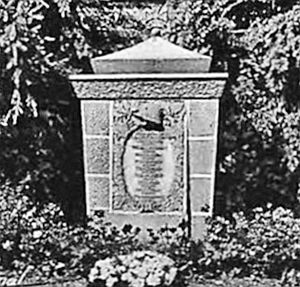Denkmal für die Gefallenen des 1. Weltkriegs: Unten verjüngter Quader mit eingelassener verzierter Widmungs- und Namenstafel mit Stahlhelm. Deckstein spitz zulaufend und gekrönt von einem EK-Zeichen (abgerissen).