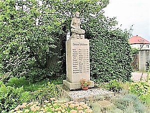 An der Hauptstraße steht ein heller quaderförmiger Stein, oben eine Skulptur einer knienden Frau mit Eichenlaubkranz.