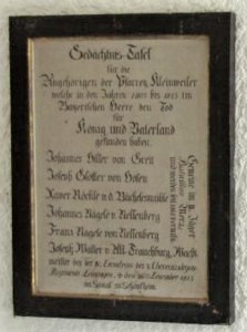 Tafel Bild 1 Gedächtnistafel für die Angehörigen der Pfarrey Kleinweiler, welche in den Jahren 1805 – 1815 im Bayerischen Heere den Tod für König und Vaterland gefunden haben. (Namen)