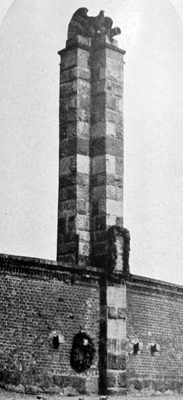 Denkmal für die im 1. Weltkrieg Gefallenen des in Königsberg stationierten Fußartillerie-Regiments „von Linger“ (Ostpreußisches) Nr.1: In eine Mauer eingearbeitete hohe Stele mit krönendem Adler, der ein Kanonenrohr in den Fängen hält.