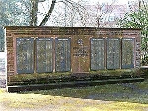 Kriegerdenkmal im Klosterhof. Mauer mit sechs Namenstafeln, je drei links und rechts neben einer Inschrift.