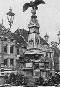 Denkmal für die Gefallenen der Kriege 1864, 1866, 1870/71: Reich verzierter Unterbau mit eingelassenen Widmungstafeln und vier Kugeln an den Ecken. Darauf ein abgestufter Obelisk mit EK-Zeichen und Plakette mit Portrait des Kaisers, sowie krönendem Adler (abgerissen).