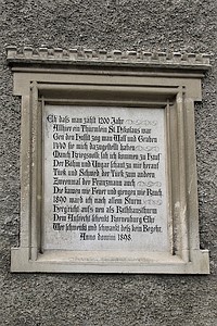 Eh’ dass man zählt 1200 Jahr Allhier ein Türmlein St. Nikolaus war Gen’ den Hussit zog man Wall und Graben 1440 sie mich dazugestellt haben. Manch Kriegsvolk sah ich kommen zu Hauf’ Der Böhm und Ungar schaut zu mir herauf Türk und Schwed der Türk zum andern, Zweenmal der Franzmann auch Die kamen wie Feuer und giengen wie Rauch. 1890 ward ich nach allem Sturm Herg’richt auf’s neu’ als Rathhausturm Dem Aufrecht schenkt Korneuburg Ehr’ Wer schwenkt und schwankt, dess kein Begehr. Anno domini 1898