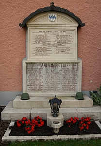 Kriegerdenkmal auf dem Friedhof bei der Kirche St. Vitus. Zwei übereinander angebrachte Gedenksteine auf einem Podest an einer Hauswand.