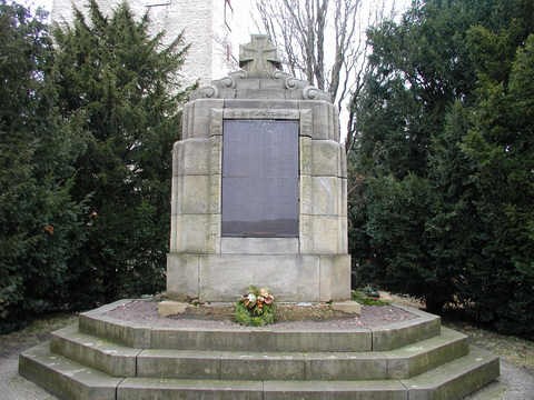 Denkmal gekrönt mit einem Eisernen Kreuz. In der Mitte eine Tafel mit den Namen der Gefallenen.