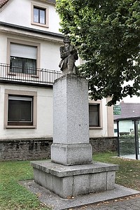 Kürzell (Kirche), Gemeinde Meißenheim, Ortenaukreis, Baden-WürttembergPLZ 77974 Bei der Kirche St. Laurentius; quadratische Säule auf einem Sockel, oben mit knieendem Soldaten, Inschriften und Namen auf allen Seiten, Namen nicht mehr lesbar.