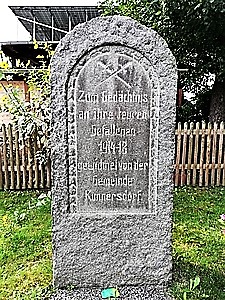 Kunnersdorf, Gemeinde Augustusburg, Landkreis Mittelsachsen, SachsenPLZ 09573 Gedenkstein mit Inschrift in Erinnerung an den 1. Weltkrieg und gekreuzten Seitengewehren als Symbolgestaltung - keine Namensnennungen - aufgestellt an der Kreuzung Kunnersdorfer Straße - Kleinolbersdorfer Straße.