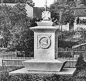 Denkmal für die Gefallenen des 1. Weltkriegs: zweistufiger Sockel, darauf Quader mit Widmung und Relief von Stahlhelm, Ehrenkranz und gekreuzten Schwertern. Darauf zweistufiger Deckstein und krönendes EK-Zeichen (abgerissen).