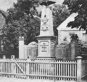 Nach dem 1. Weltkrieg wurden halbrunde Seitenflügel angefügt mit den Namen der Gefallenen, Stahlhelm-Reliefs darüber und EK-Zeichen an den Enden.
