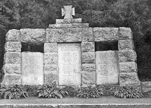 Denkmal für die Gefallenen des 1. Weltkriegs: Aus Natursteinen gemauerte Torbögen mit drei eingelassenen Widmungs- und Namenstafeln, gekrönt von einem EK-Zeichen, daran halbrunde flache Mauer mit Pfeilern mit krönenden Kugeln an den Enden (abgerissen).