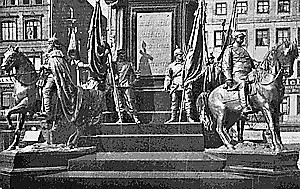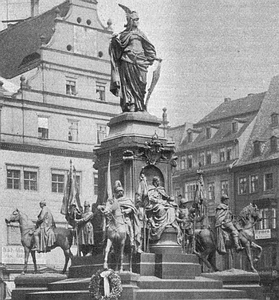 Siegesdenkmal für den Krieg 1870/71 auf dem Rathausplatz: Verzierte Stele mit eingelassenen Tafeln und krönender Germaniafigur, Schild und Schwert haltend. Stele umrandet von Fahnenträger-Figuren verschiedener Regimenter und sitzender Figur Kaiser Wilhelms I. An den Ecken des Denkmals jeweils ein Reiterstandbild von Bismarck, Moltke, Kaiser Friedrichs III. und König Albert von Sachsen. Nach 1945 abgerissen.