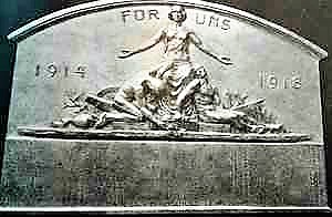 Gedenktafel für die Gefallenen im 1. Weltkrieg aus der Handelshochschule: Oben Relief einer segnenden Frau mit zwei sterbenden Kriegern zu ihren Füßen. Einer hält ein zerbrochenes Schwert, der andere einen Lorbeerzweig. Sie sind umrandet von zerstörtem Kriegsgerät. Darunter sind die Gefallenen aufgelistet (vernichtet).