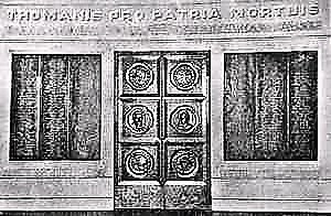 Gedenkwand in der Thomasschule für die Gefallenen Schüler und Lehrer im 1. Weltkrieg: Metallbeschlagene Tür mit Stahlhelm und EK-Reliefs sowie Portraits eines älteren und jüngeren Mannes (Lehrer und Schüler symbolisierend). Rechts und links Namenstafeln und darüber die Inschrift unterlegt mit Lorbeer (vernichtet).