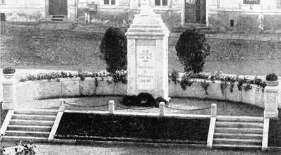 Für die Gefallenen des 1. Weltkriegs eine erhöhte Denkmals-Anlage mit zwei Treppenaufgängen, die zu einer breiten viereckigen Stele mit vertieften Widmungs- und Namensfeldern führten. Auf der Stele abgestufte Decksteine mit krönender Stahlhelm-Plastik. Umrandet von halbrunder niedriger Mauer mit Blumenkästen (umgewidmet).