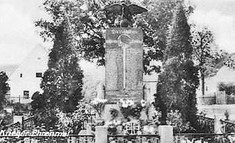 Denkmal für die Gefallenen des 1. Weltkriegs: Abgestufter Sockel. Darauf eine aufgerichtete Steinplatte mit krönendem Adler (abgerissen).