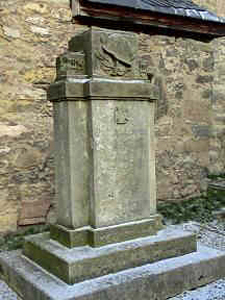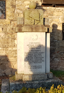 Stele mit krönendem Stahlhelm-Relief vor der Kirche. Das Denkmal trug im Jahr 2004 nur die drei Namen der Gefallenen des 1. Weltkriegs mit Todesdatum. Mittlerweile wurde es restauriert, die Sterbedaten aber nicht mehr erwähnt. Die Namen für den 2. Weltkrieg wurden ergänzt.