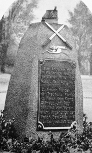 Gedenkstein für die Gefallenen der Maschinen-Gewehr-Abteilung Nr. 5 auf dem Kasernengelände: Aufgerichteter Findling mit angebrachter Widmungstafel, krönendem Tschako-Helm, gekreuzten Bajonetten und MG-Plakette.