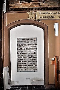 Im Eingangsbereich der Stadtkirche St. Wenzel hängt eine Wandtafel zur Erinnerung an die Gefallenen des Krieges 1870/71.