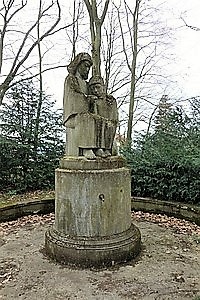 Eine Erläuterungstafel in Nähe gibt Auskunft: „…1921 konnte die parkähnliche Grünanlage des Heldenhains angelegt und 2006 erweitert werden. Eine zum Gedenken der Opfer des ersten Weltkrieges aufgestellte Bronzeskulptur musste 1942 demontiert und der Metallreserve zur Waffenproduktion zugeführt werden. Im Jahre 1955 konnte die Skulptur zweier Trauernder enthüllt werden. Sie stellt die christliche Schau des Todes dar. Eine himmlische Botengewalt reicht einem Jüngling das Wasser des ewigen Lebens, das Zugleich Zeichen des Trostes für die Lebenden ist.“