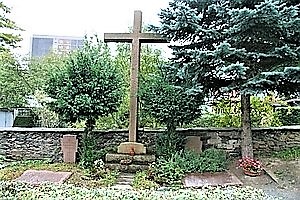 Denkmalanlage auf dem die ev.-luth. Kirche St. Ursula umgebenden Friedhof. Links und rechts neben einem übermannshohem christlichen Kreuz zwei Grabsteine. Davor liegend je eine Tafel .