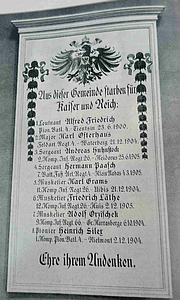 Ehemalige Gedenktafel im Dom Magdeburg für Gefallene Magdeburgs beim Boxeraufstand in China 1900 und in Deutsch-Südwestafrika 1904/1905. Die hier vorliegende Tafel war in der Regimentsgeschichte des Pionier-Bataillons Nr. 4 abgedruckt.