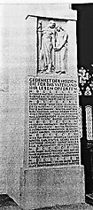 Wallonerkirche, die oben das Relief eines nackten Kriegers mit Schwert zeigte, der sich von seiner Liebsten verabschiedet.