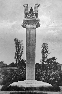 Feld-Artillerie Regiment „Prinz Luitpold von Bayern“ (Magdeburgisches) Nr. 4 im Hof der Artillerie-Kaserne: Hohe viereckige Stele mit stark verziertem Aufsatz, darauf zwei Löwenfiguren mit hoch erhobenen Köpfen.