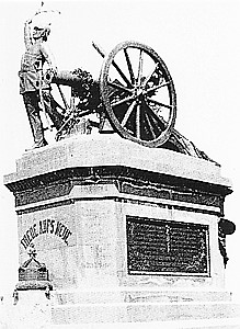Ehemaliges Denkmal für die Gefallenen des Feldartillerie Regiments Nr. 4 in den Kriegen 1866 und 1870/71. Verzierter und abgestufter Quader mit Inschriftentafeln und Kaiserkrone, gekrönt von der Figur einer Feldkanone und eines Soldaten mit erhobenem Schwert, aufgestellt in der Friedrichstadt. Buch zur Einweihung des Denkmals. Einweihungs-Urkunde.