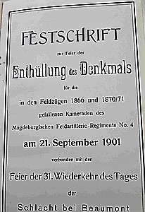 Für die Kriegsopfer der Stadt Magdeburg in den Kriegen 1864, 1866 und 1870/71 wurde direkt neben dem Dom ein großes Denkmal errichtet, das bis heute besteht. Dies wurde hier schon in einem Kapitel beschrieben unter: ../2012/magdeburg_sa.html Alle weiteren Denkmäler und Gedenktafeln dieser Kriege in Magdeburg existieren heute nicht mehr, einschließlich des hier vorgestellten. Vom Denkmal des Feldartillerie-Regiments Nr. 4 existieren sehr viele alte Postkarten. Darauf sind nie Inschriften zu erkennen. Zum Glück ist im Stadtarchiv Magdeburg ein Büchlein zur Einweihung erhalten mit dem Titel: „Festschrift zur Feier der Enthüllung des Denkmals für die in den Feldzügen 1866 u. 1870/71 gefallenen Kameraden des Magdeb. Feld-Artillerie-Regiments No. 4, verbunden mit der Feier der 31. Wiederkehr des Tages der Schlacht bei Beaumont. Herausgegeben vom Kameraden Alwin Kiess, Magdeburg“. Dort ist die Inschrift der Widmungstafel sowie eine Ehrentafel mit den Namen der Gefallenen abgedruckt. Ob diese Namen so auf einer Tafel am Denkmal angebracht waren ist nicht vermerkt. Es wird hier alles zu dieser Ehrentafel beschrieben. Die Namen werden aber nur bei den Verlustlisten veröffentlicht. Zur Einweihung wurde auch eine prächtige handschriftliche großformatige Einweihungs-Urkunde in Goldschrift angefertigt, die heute noch im Original im Stadtarchiv erhalten ist. Sie ist auch in dem vorher notierten Buch abgedruckt.
