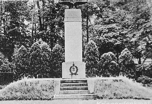 Denkmal für die Gefallenen des 1. Weltkriegs: Auf einem kleinen Hügel mit Treppe eine abgestufte hohe Stele mit krönendem Adler und Lorbeerkranz unten (abgerissen)