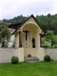 Neben der Kirche „Zum heil. Oswald König“: Eine kleine offene Kapelle mit zwei Marmortafeln, in der Mitte zwischen ihnen ein Jesuskreuz. Rechts und links davon je eine Figur eines Soldaten, der sich auf sein Gewehr stützt. Über dem Kreuz eine bogenförmige Inschrift. Unterhalb des Kreuzes eine weitere kleine Marmortafel. Auf dem Friedhof der Kirche Gedenksteine.