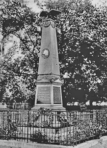Denkmal für die Gefallenen des 1. Weltkriegs: Abgestufter Obelisk mit Widmungs- und Namenstafeln unten, Stahlhelm-Relief in der Mitte und krönenden EK-Zeichen mit Adler (abgerissen).