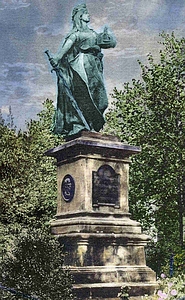 Ehemalige Denkmäler für Gefallene in Meseritz: Denkmal für die Gefallenen der Kriege 1864, 1866 und 1870/71. Abgestufter Quader mit Widmung und Plaketten, darauf Bronzefigur einer Germania mit Schwert und Krone in den Händen.