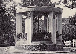 Denkmal für die Gefallenen des 1. Weltkriegs: Rondell mit sechs Säulen, die jeweils für ein Jahr des Krieges und der Grenzkämpfe 1919 und 1920 standen, mit Namenstafeln an den Innenseiten. Am oberen Ring waren eine umrandende Inschrift und darunter sechs Wappen angebracht.