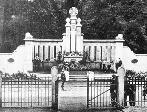 Denkmal für die Gefallenen des 1. Weltkriegs: In der Mitte drei runde Säulen mit den Inschriften und krönendem EK-Zeichen. Flankiert von halbrunden Flügeln mit je sieben Säulen mit den Namen der Gefallenen. An den Enden oben Stahlhelm-Plastiken (abgerissen).