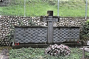 Bei der Kirche; aus Betonsteinen gemauerte Wand mit Namen versehen, dazwischen Steinkreuz.