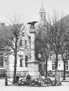 Denkmal für die Gefallenen des Krieges 1870/71: Abgestufter Quader mit Widmungs- und Namenstafeln, darauf eine klassische Säule mit krönendem Adler. Denkmal wahrscheinlich ergänzt um Tafeln für die Gefallenen des 1. Weltkriegs (abgerissen).