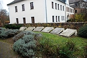 verwittert sind. Daneben liegen sechs Steinplatten auf welchen sich die Namen der Gefallenen des 2. Weltkriegs befinden,
