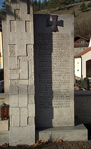 Kriegerdenkmal auf dem Friedhof. Steinsäule, daneben angebracht eine Gedenkplatte.