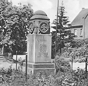 Denkmal für die Gefallenen des 1. Weltkriegs: Abgestufte Stele mit großen EK-Zeichen in Ehrenkränzen oben auf allen vier Seiten (abgerissen).