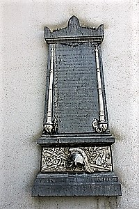 Aussen an der kath. Pfarrkirche eine Gedenktafel seitlich zwei Zepter und darunter Bildrelief