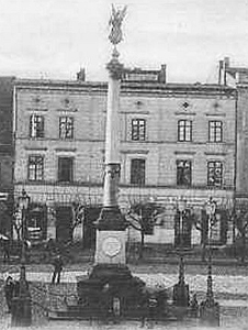Denkmal für die Gefallenen des Krieges 1870/71 auf dem Marktplatz: Abgestufter Sockel, darauf Quader mit aufgesetzter Säule und krönender Figur einer Siegesgöttin mit Lorbeerkranz. Denkmal umrandet von vier Kandelabern. Auf dem Sockel des Denkmals befand sich nur eine kurze (unbekannte) Inschrift. An einer Seite befand sich ein großes EK-Zeichen (abgerissen).