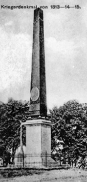 Denkmal für die Gefallenen des Befreiungskrieges 1813-1815: Hoher Obelisk mit (unbekannten) Inschriften im unteren Teil und Plaketten darüber (abgerissen).