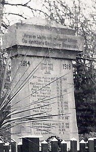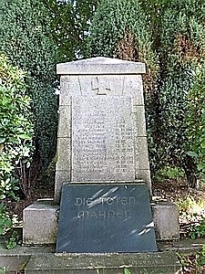 Denkmal-Nr.: 09232443 Gestuftes Postament, darauf flache Stele mit pyramidalem Abschluss, Frontfläche als Schrifttafel auf Putznutung mit Eisernem Kreuz, Inschrift; angelehnt schwarze Steintafel mit Inschrift (vermutlich nach dem Zweiten Weltkrieg), für die es noch keine namentliche Ergänzungen gab, davor an der Straße Eichen.