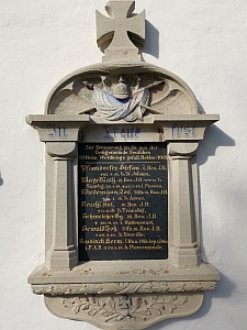 Kriegerdenkmal an der Außenseite der Kirche St. Martin. In der Mitte einem Tempeleingang nachempfundene Umrandung