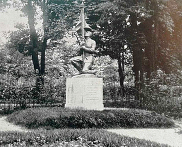 Denkmal des Kaiser Alexander Garde Grenadier Regiments Nr. 1 auf dem Garnisons-Friedhof: Quader mit Inschriften und darauf die große Bronzefigur eines knienden Fahnenträgers. Später angebrachte Inschriften von Divisionen des 2. Weltkriegs.