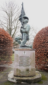 Das Denkmal für das Garde Grenadier Regiment Nr. 1 steht heute auf dem Garnisonsfriedhof am Columbiadamm in Berlin Neukölln. Es wurde vom Bildhauer Kurt Kluge geschaffen. Die Figur soll seinen 1914 gefallenen Freund, den Fahnenjunker Eberhard Freiherr von der Recke von der Horst darstellen. Das Denkmal wurde 1927 in der Hasenheide aufgestellt und 1938 in die Kaserne des Infanterie Regiments Nr. 67 in Ruhleben versetzt. 1957 wurde es dann endgültig zum Garnisonsfriedhof verlegt und Widmungen der Traditionsverbände des 2. Weltkriegs hinzugefügt. Das historische Bild entstammt dem Buch: „Deutscher Ehrenhain für die Helden von 1914/18“ im Dehain Verlag, Leipzig 1931.