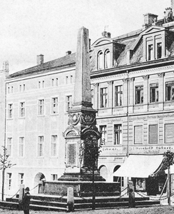 Denkmal ür die Gefallenen des Krieges 1870/71: Verzierter abgestufter Obelisk mit eingelassenen Widmungs- und Namenstafeln, Ehrenkränzen und Girlanden.